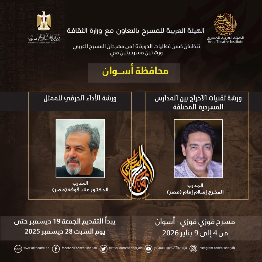 تنظم الهيئة العربية للمسرح عددًا من الورش التدريبية بمحافظة أسوان، وذلك ضمن فعاليات الدورة السادسة عشرة، وتشمل ورشة الأداء الحِرفي للممثل للدكتور علاء قوقة، وورشة الإخراج من النص إلى العرض للمخرج إسلام إمام.